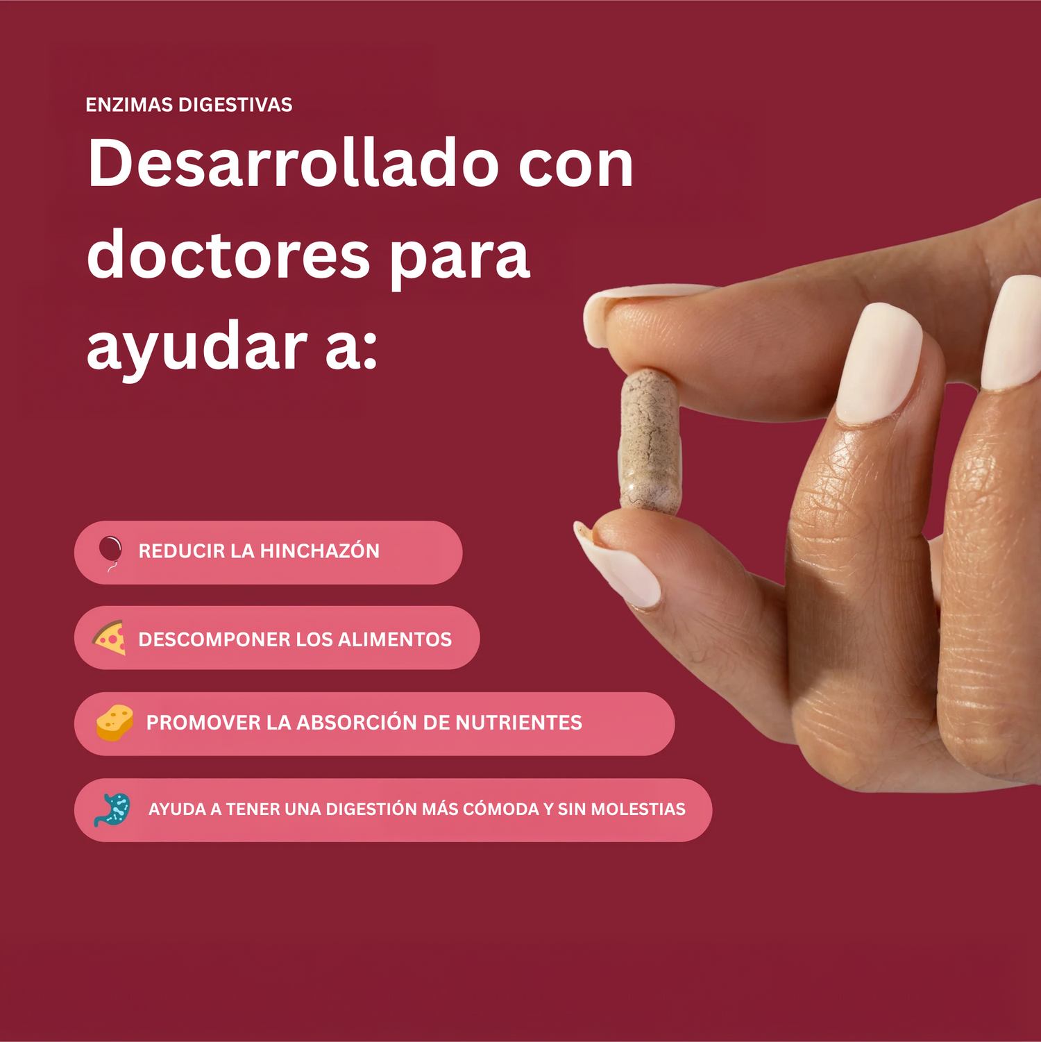 "Nunca pensé que las enzimas digestivas me ayudarían tanto. Siempre tenía hinchazón y malestar después de comer… ahora mi digestión es mucho más ligera y regular. No causan molestias, no saben raro, ¡y funcionan rápido!"